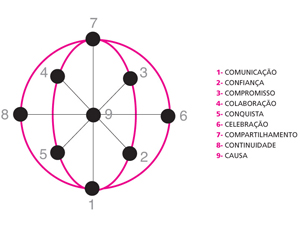 Trata-se de uma “mandala” com nove pontos de referência que estabelece comportamentos, atitudes e competências que uma equipe disciplinada deve ter para se tornar bem sucedida.